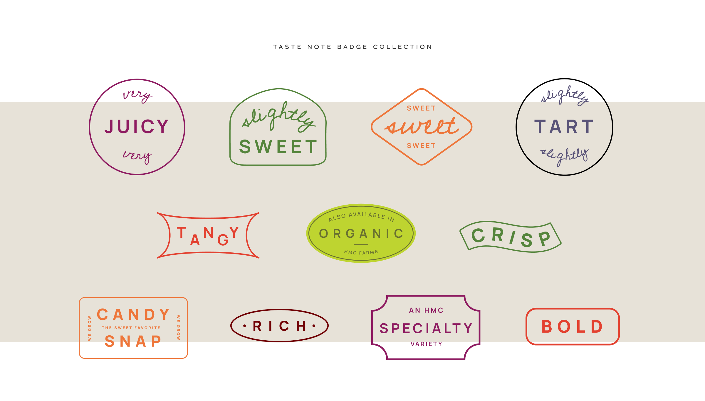 The badges were designed to visually represent HMC Farms’ product diversity, including flavor profiles, availability, and the distinction between organic and non-organic products. These badges help communicate key information quickly and engage users without overwhelming them with too much text or complexity.