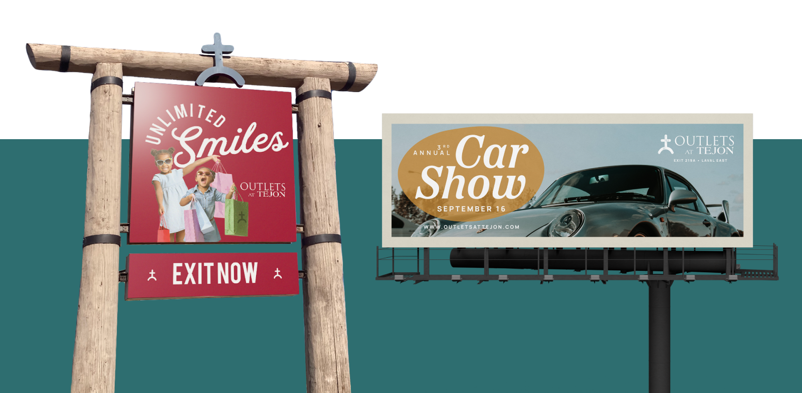 With the backbone of Tejon Ranch’s historic brand and the Outlet’s established logo mark, our main priority fell to really beginning to round out the visual world of the brand. The outdoor shopping center is a unique spot in Kern County where folks can shop, eat, let their kids get their wiggles out all while getting to connect with the outdoors. For their visual identity, we saw an opportunity to capture that joy, brightness and excitability the Outlet’s provides their customers.